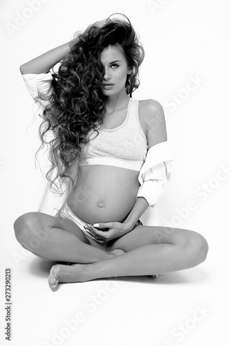 beautiful pregnant woman with dark curly hair in lingerie and robe posing in studio