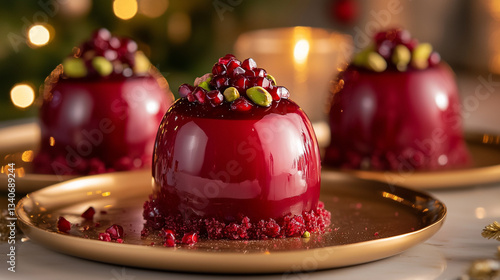 Beautiful red dessert with pomegranate and pistachio garnishes on elegant plates during a festive celebration Generative AI