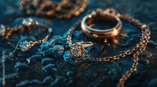 Beautiful rings and necklaces on dark blue surface, AI generated image