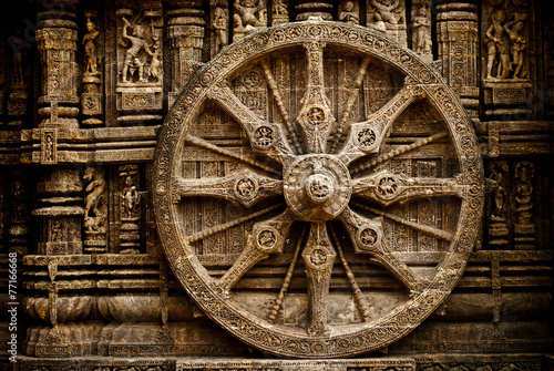 Beautiful sandstone chariot Wheel of Konark Sun Temple, Orissa