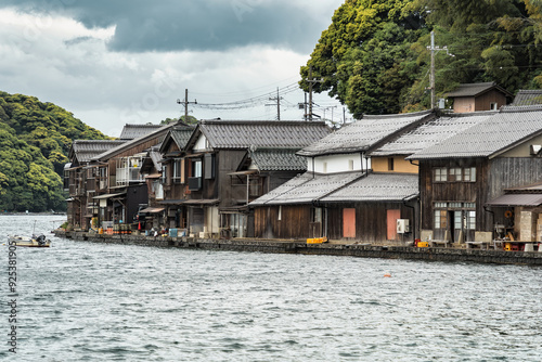 Beautiful scenic view with the wooden traditional waterfront boat houses called funaya around Ine Bay, in the village Ine, Japan