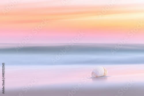 Beautiful seashell resting on a smooth sandy beach during a pastel-colored sunset with soft ocean waves in the background. Perfect for calm coastal and nature-themed visuals.