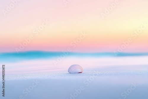 Beautiful seashell resting on a smooth sandy beach during a pastel-colored sunset with soft ocean waves in the background. Perfect for calm coastal and nature-themed visuals.