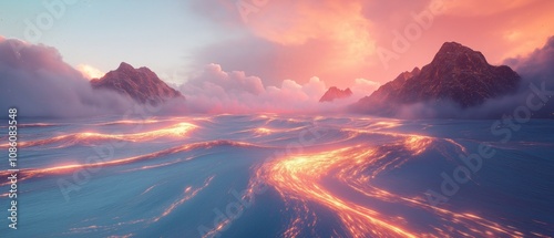 Beautiful, serene landscape with a glowing lava flow in the middle. The sky is a mix of pink and blue, creating a calming atmosphere