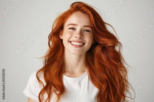 Beautiful Smiling Young Woman with Long Red Hair in White T-Shirt: Portrait Isolated on Light Grey Background
