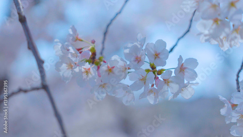Beautiful spring scenery video of Korea where branches of white cherry blossom trees in full bloom under the blue sky are scattered in the spring breeze