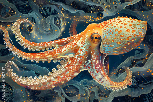 Beautiful Squid Colorful Illustration. Intricate Details, Children's Book Illustration Style. Created with Generative AI