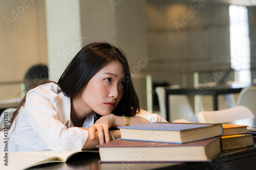 Beautiful student wearing white shirt feeling bored while reading books on the table in library