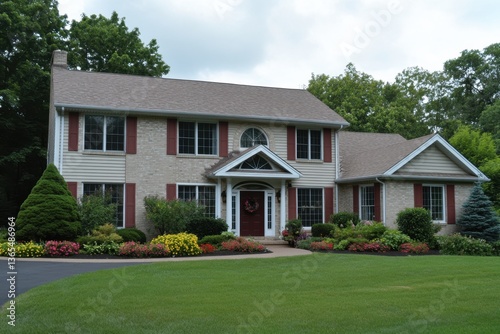 Beautiful suburban home with manicured garden and vibrant flowers under a cloudy sky