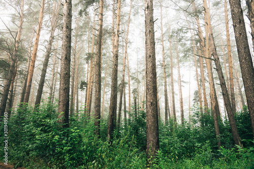 Beautiful summer forest with different trees in morning fog