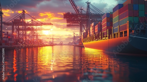 Beautiful Sunset Over Shipping Port with Cargo Containers and Cranes Reflecting in Calm Water at Dusk, Creating a Serene Maritime Scene for Industrial and Transport Themes