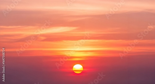 Beautiful sunset with a bright sun on the horizon. Colorful sky with orange, pink, and red clouds at dusk. Serene and peaceful evening landscape.