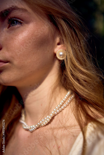 beautiful teenage girl in a silk skirt and a corset in the old money style walks in the park and along the river bank