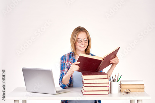 Beautiful teenage schoolgirl sitting at desk with stack of books on it