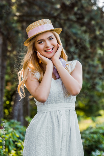 beautiful tender blonde girl in dress and wicker hat with ribbon smiling at camera in park