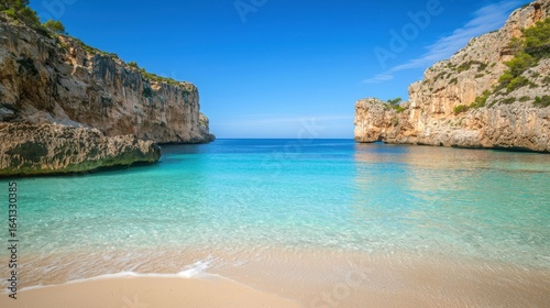 Beautiful turquoise waters meet golden sand on a serene beach surrounded by cliffs under a clear blue sky in Mallorca
