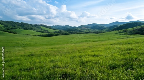 Beautiful vast green landscape with rolling hills under a bright blue sky filled with fluffy white clouds : Generative AI