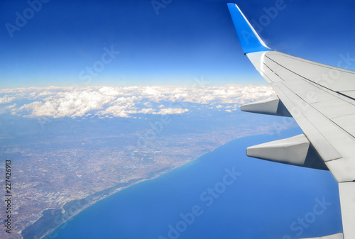 Beautiful view of earth and sea under the wing of plane. Costal city view from above. Travel concept. Freedom concept.