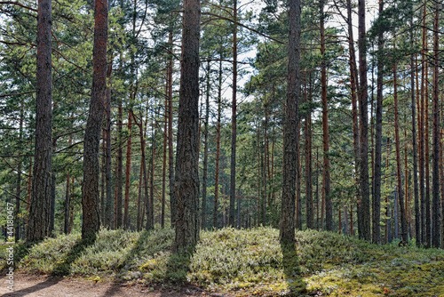 Beautiful view of the pine forest in sunny summer day.
