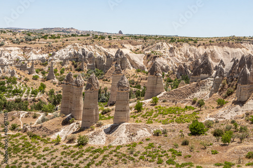 Beautiful view of the valley of love in Cappadocia with mountain peaks in the summer day