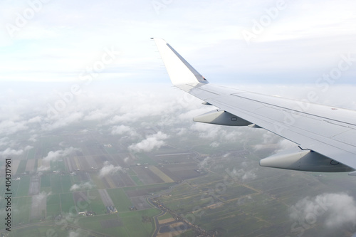Beautiful white clouds floating high angle air, viewed from airplane window.