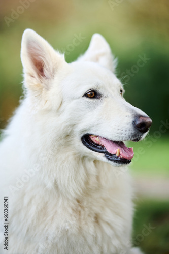 Beautiful White Swiss Shepherd Dog with blurred green background. Portrait of a dog with tongue