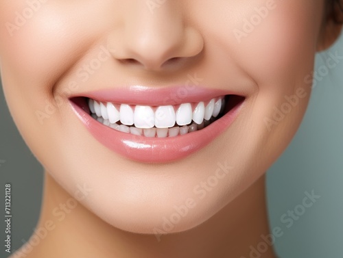 Beautiful wide smile of healthy woman, white teeth close up. Generative AI