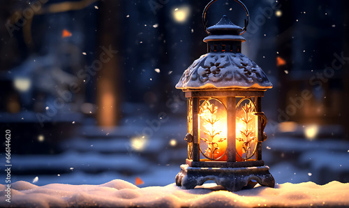 Beautiful winter background Christmas decoration with a lantern in the snow in a winter park image of frosted spruce branches and small drifts of pure snow with bokeh.
