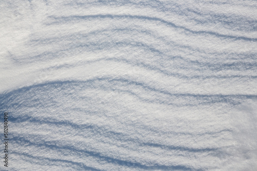 Beautiful winter background with snowy ground. Natural snow texture. Wind sculpted patterns on snow surface.
