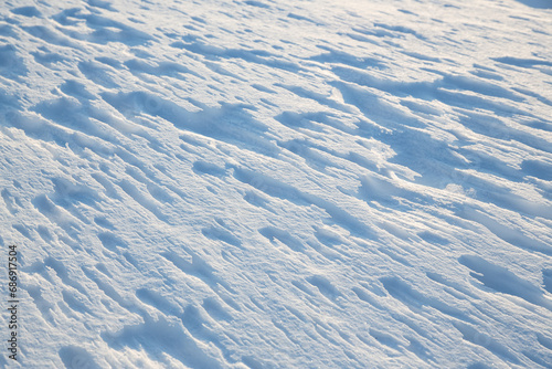 Beautiful winter background with snowy ground. Natural snow texture. Wind sculpted patterns on snow surface.