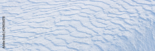 Beautiful winter background with snowy ground. Natural snow texture. Wind sculpted patterns on snow surface. Wide panoramic texture for background and design.