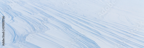 Beautiful winter background with snowy ground. Natural snow texture. Wind sculpted patterns on snow surface. Wide panoramic texture for background and design.