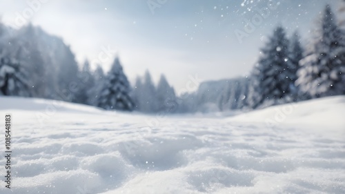 beautiful winter day in a serene snowy landscape background. fresh, untouched snow covers the ground, in the background, snow-covered pine trees create a blurred backdrop