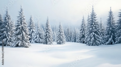Beautiful winter landscape of a snow-covered forest in the mountains, presenting an ideal Christmas scene with snowy dendritic spruce trees and ample space for copy.