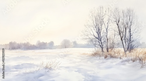 Beautiful winter landscape with snow-covered field, bare trees, and soft overcast sky. Serene and tranquil nature scene.