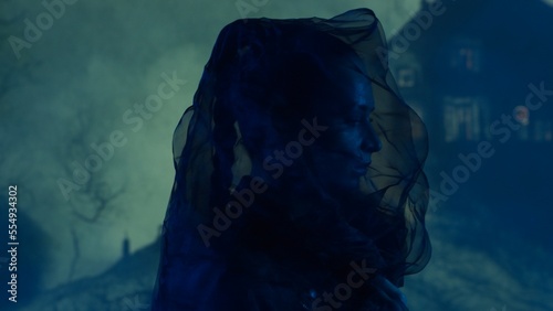 Beautiful witch making the witchcraft over the smoky background at night. Scary house on the hill. Halloween image.