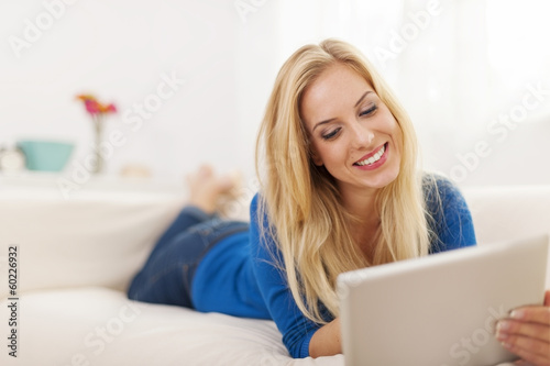 Beautiful woman lying down on couch and using digital tablet