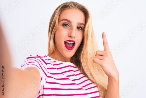 Beautiful woman wearing striped t-shirt make selfie by camera over isolated white background surprised with an idea or question pointing finger with happy face, number one