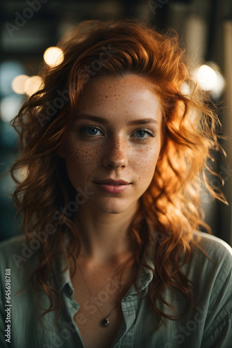 beautiful woman with freckles taking a selfie looking at the camera . Image created using artificial intelligence.