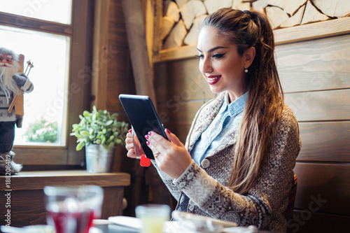 Beautiful young businesswoman in the cafe, using digital tablet and drinking coffee smiling