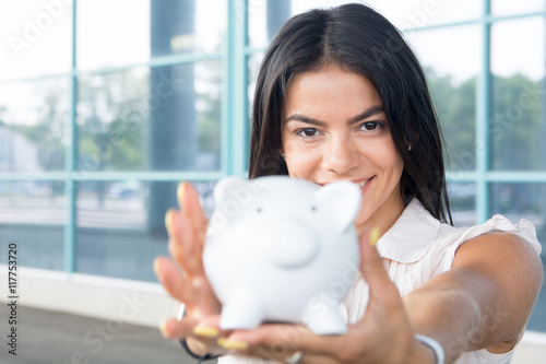 beautiful young woman pwith piggy bank