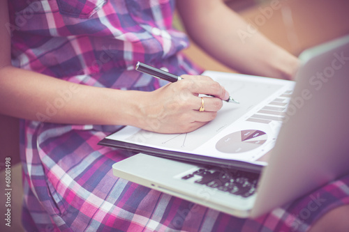 Beautiful young woman using laptop in park