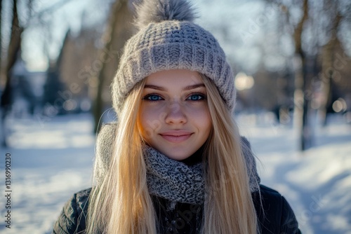 Beautiful young woman wearing a hat outdoors in winter, close-up portrait, beautiful blonde girl on a sunny day against the backdrop of a snow-covered park