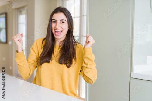 Beautiful young woman wearing yellow sweater celebrating surprised and amazed for success with arms raised and open eyes. Winner concept.