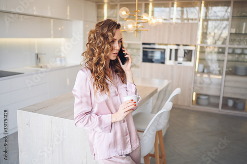 Beautiful young woman with curly hair drinking coffee at home in lazy weekend morning in cozy pink pajamas. Lady speaking phone in scandinavian style white kitchen interior. Distance work from home
