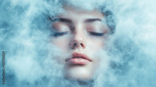 Beautiful young woman's head enveloped by fluffy white cloud obscuring her face, symbolizing brain fog and mental confusion. Studio shot on neutral background. Modern conceptual art