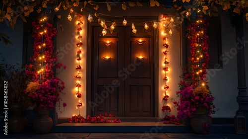 Beautifully decorated front door for Diwali, with glowing diyas, string lights, and flower garlands