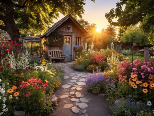 Beautifully detailed image of a blooming cottage garden at golden hour. A wooden garden path winding through a riot of colorful flowers: roses, lavender, sunflowers, daisies, all buzzing with bees. An