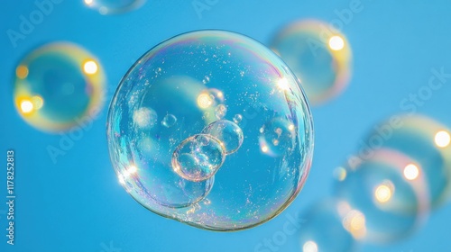 Beautifully floating transparent soap bubbles on a light blue background, each capturing the soft reflections and light patterns of a calm day