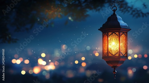 Beautifully Lit Lantern Hanging Against Deep Evening Sky with Bokeh City Lights in Background